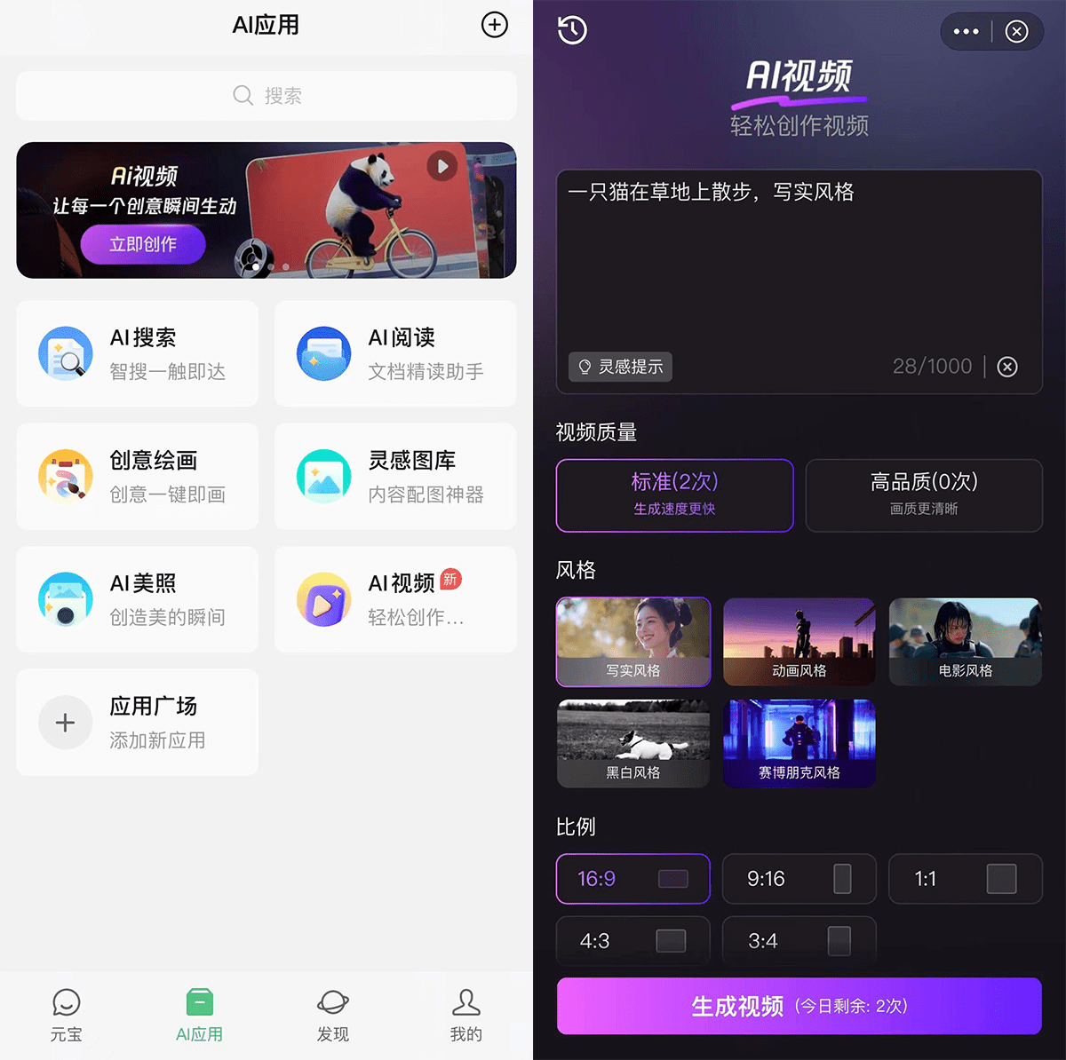 腾讯混元文生视频功能已上线腾讯元宝APP,用户可以在腾讯元宝【AI应用】版块中点击“AI视频”申请试用。